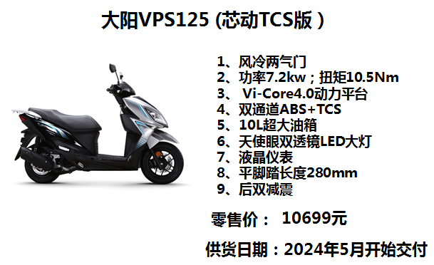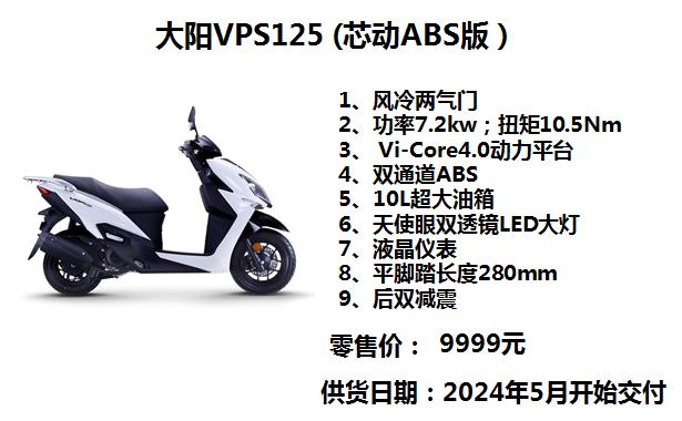 加之双通道ABS+TCS,10L油箱、后双减震、液晶仪表使大阳VPS125在实用配置和动力表现上都明显越级发挥,此次发布的新配色,也为市场提供了更多选择。