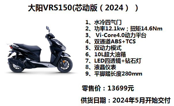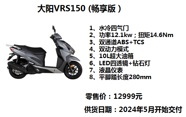 动力方面,VRS150搭载了一台150mL侧置式水冷四气门发动机,最大功率12.1kW(8500r/min),最大扭矩14.6N•m(6500r/min)。其整体动力输出兼顾了低、中、高三个速度段,具备低速提速迅敏直接,中高速输出充沛,加速顺畅等特点。
