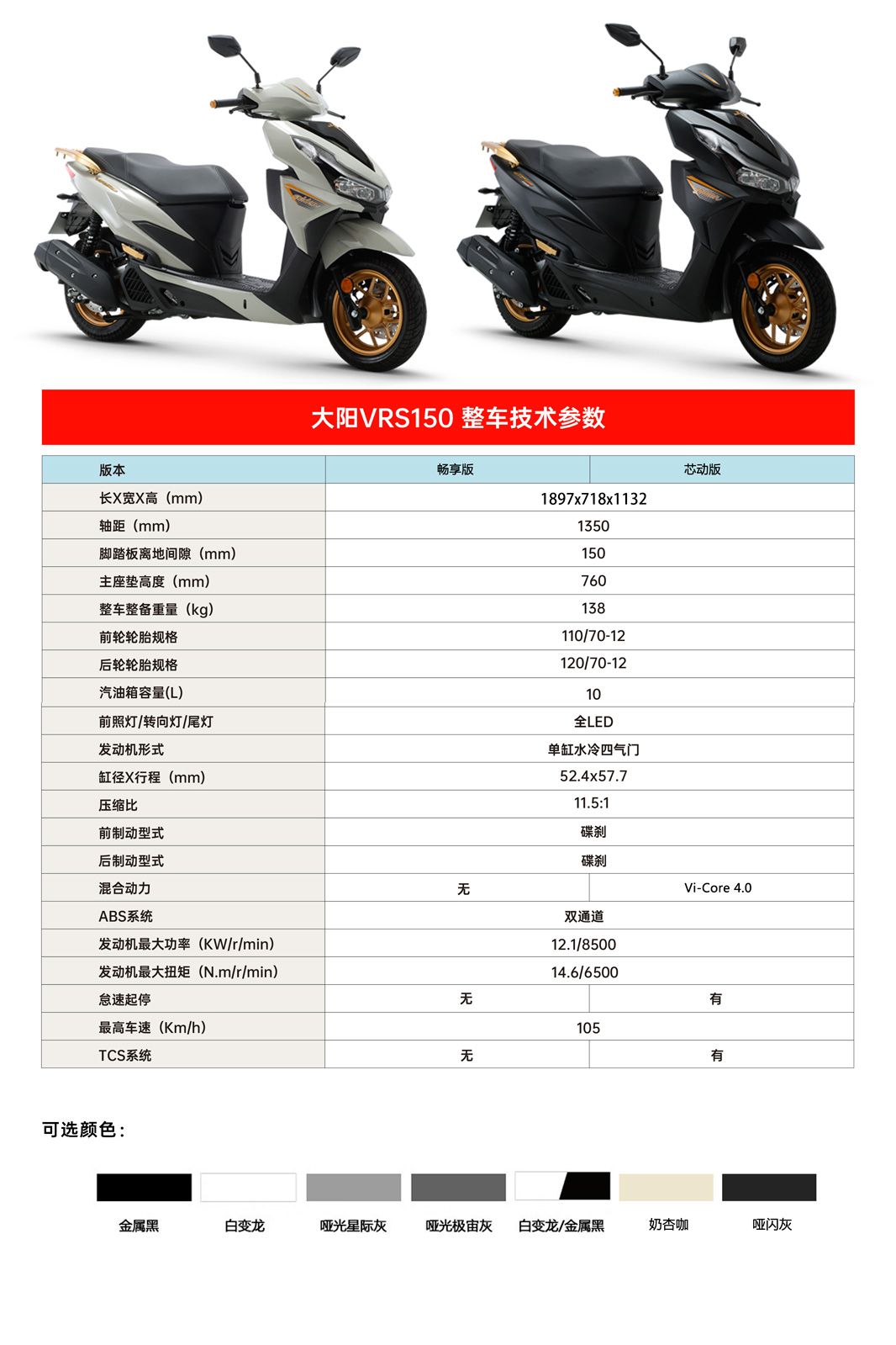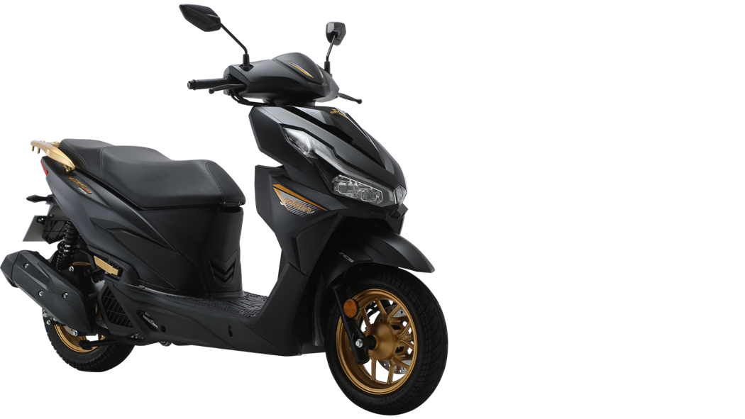 VRS150金大阳纪念版同样基于2024款大阳VRS150打造,也有哑闪黑、奶杏咖两种新外观配色,带有金色轮辋、后货架、脚踏、车标、纪念版专属贴花等。